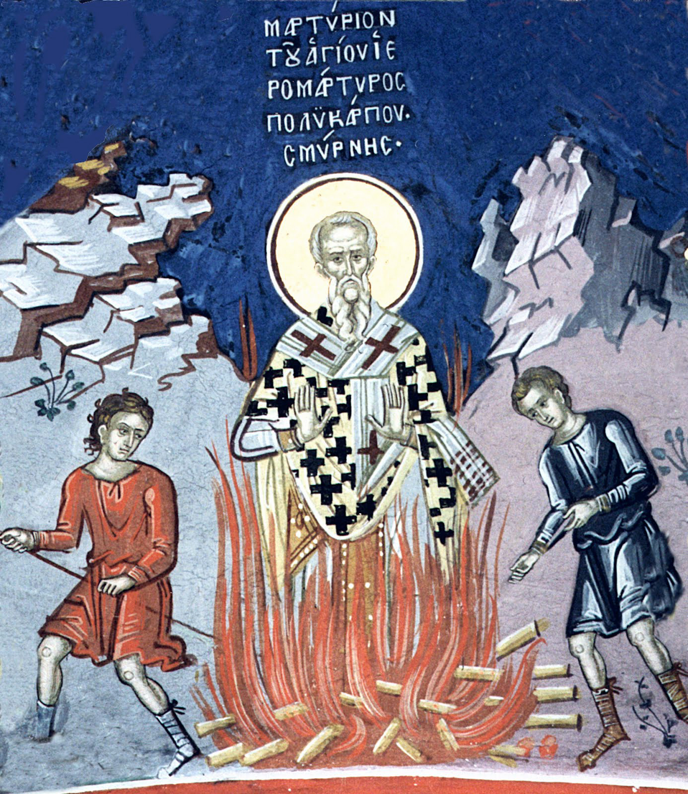 “86年以来,我一直侍奉主耶稣基督,看到的只有善,我怎么能弃绝呢?得得得嗯呢呗…好” 他说,就连把他扔给野兽或活活烧死的威胁都不能动摇他。然后法官下令向众人宣布波利卡普犯了奉行基督教信仰的罪行,并为此被判处火刑。波利卡普被绑在柱子上,周围生起了大火。他静静地站着,没有反抗,祈祷着。当火焰蹿起来吞噬了他的时候,仿佛是被光包围着。一名士兵用长矛刺穿了他的心脏。根据法官的命令,尸体被烧毁,这样波利卡普的门徒就不能将他埋葬。