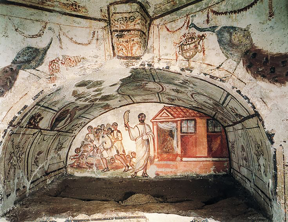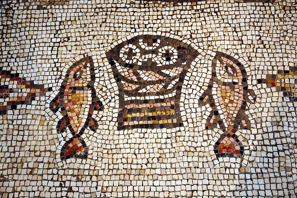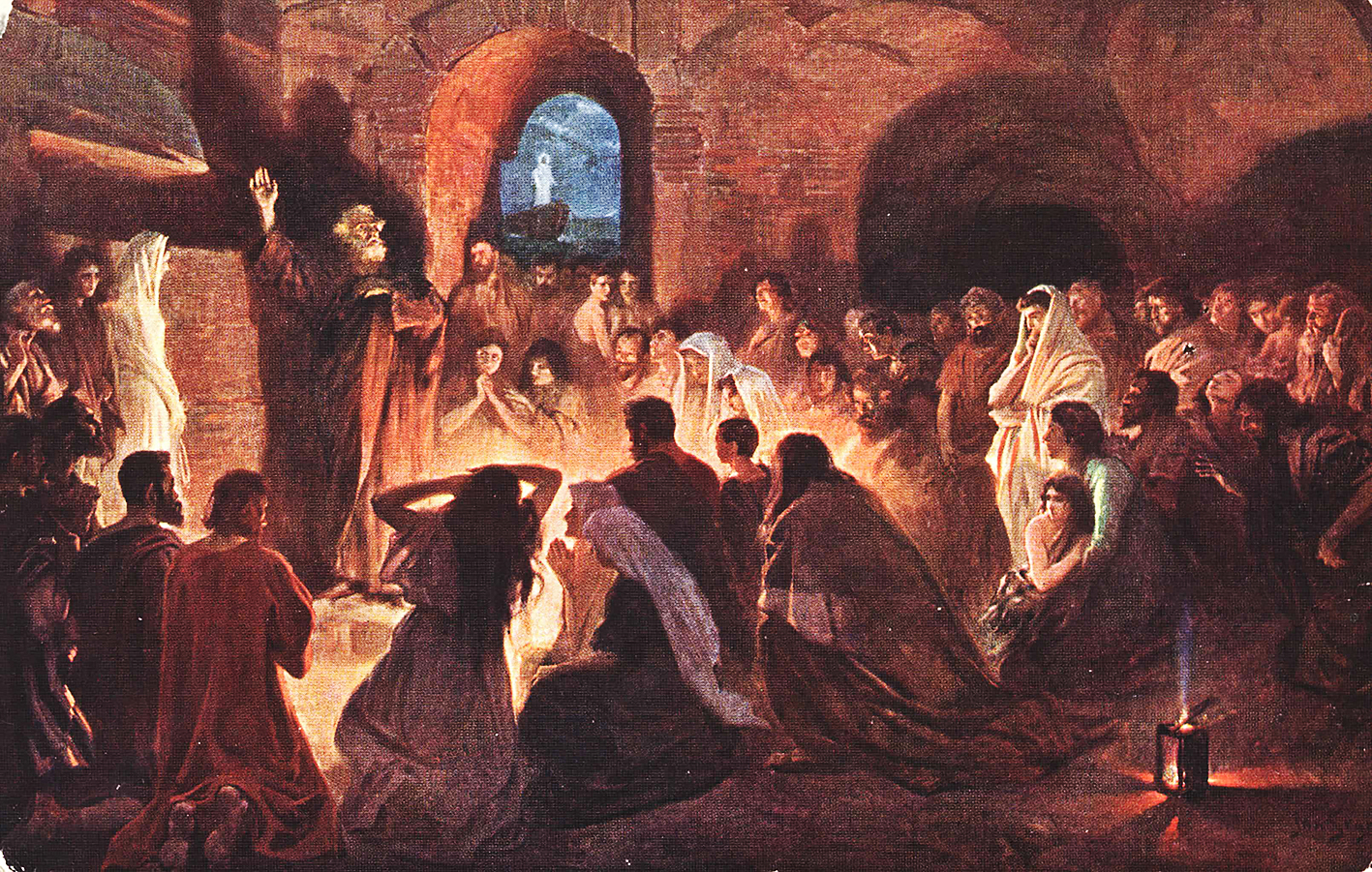 早期教会中的象征性图像。 教会从一开始就经历了迫害,首先是被拒绝耶稣是他们弥赛亚的犹太宗教领袖迫害,从1世纪60年代起又被罗马国家迫害。因此,祈祷会是秘密举行的,基督徒必须在他们聚集祈祷的地方用特殊的标志或图片作记号。例如,基督被描绘成一个牧羊人,肩上扛着一只羊,这在祂的一个寓言中有所描述(约10:1-16)。希腊语中的 “鱼” 也是一个缩写,在俄语中的意思是:上帝的儿子耶稣基督救世主。因此,如果有人默默地在沙地上画了一幅鱼的图画,人们可以理解为这是一个基督徒。