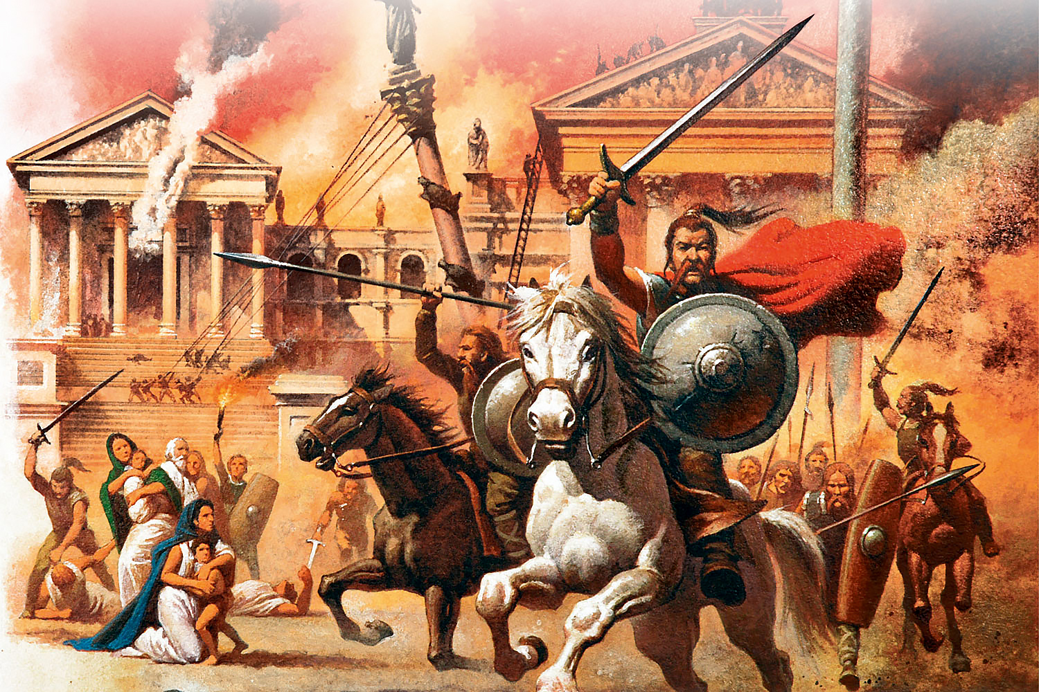 民族大迁徙和阿拉伯征服。到七世纪,罗马帝国的政治地位已经发生了很大的变化。这是一种被称为“民族大迁徙”的历史现象的结果。希腊人称所有外来民族为野蛮人(来自barbaros---说话听不懂的人),帝国的西部地区至此已经经历了三个世纪的野蛮人的入侵,匈奴人—来自中亚的游牧民族,在4世纪的最后时期来到这里。他们起初征服了多瑙河下游的奥斯特哥特人(东哥特人)的国家,摧毁了罗马帝国的西部地区,然后又回去了。接替他们的是汪达尔人(vandal)---来自中欧的日耳曼部落,他们在406年向西行进,穿越了整个高卢,并于409年到达西班牙。“Vandal”这个词成为与他们对罗马的破坏有关的代名词。然而,20年后,其中的一部分人迁往北非,在那里建立了自己的王国,而另一部分人则被入侵西班牙的西哥特人打败了。他们的领袖奥多亚克于476年击败了西方帝国的最后一位皇帝朱利叶斯·尼波斯,将皇帝的徽章送到君士坦丁堡,交给拜占庭皇帝芝诺。但于493年,西哥特人在意大利被德奥多里克领导的东哥特人击败,后者在那里建立了一个王国。不过,拜占庭在6世纪到7世纪期间曾几次重新获得对意大利的控制。尽管如此,希腊人当时在西部却有强大的对手,即莱茵河畔的法兰克人。起初,法兰克人依赖于君士坦丁堡,他们的国王克洛维格(Chlodwig)在五世纪80年代征服了高卢,接受了基督教并为其人民进行了圣洗。法兰克人在八世纪末达到了他们的最高权力,当时国王查理曼大帝(742-814)宣布了复兴罗马(西方)帝国的路线,他于公元800年在罗马被教宗莱翁三世加冕为皇帝。君士坦丁堡方面将此视为对自己的直接挑战,因为它之前一直被视为罗马帝国的唯一中心。