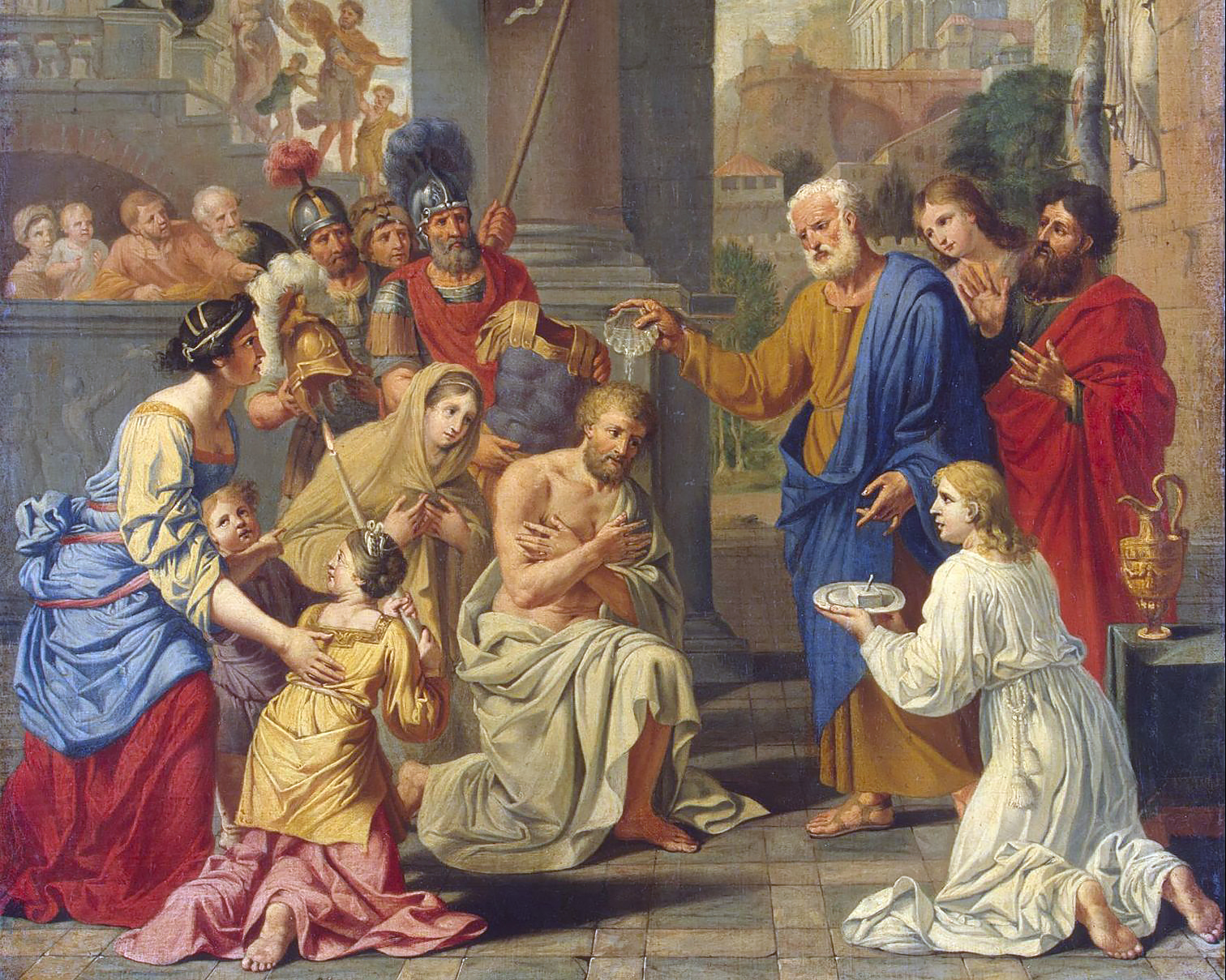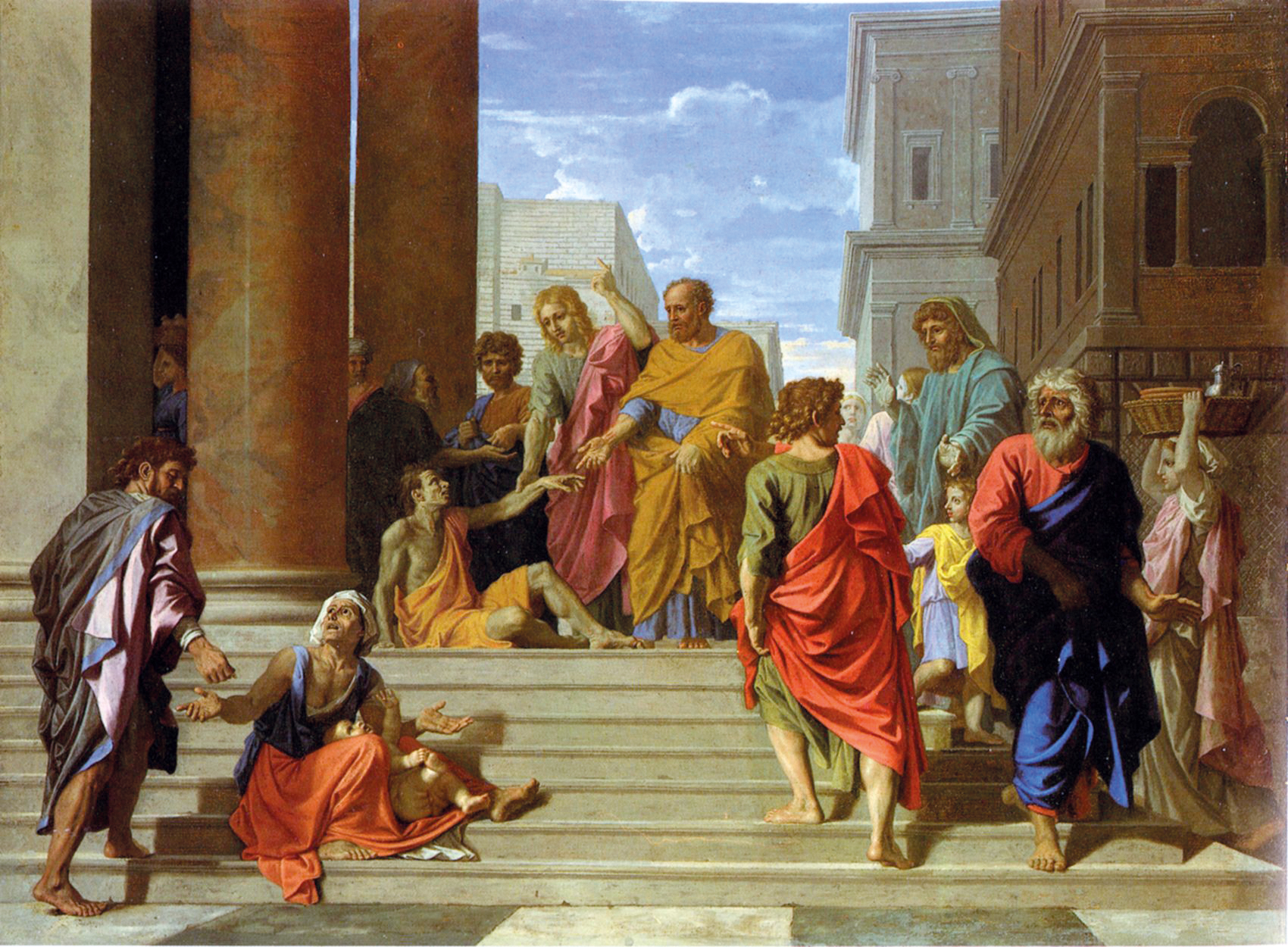 第一个奇迹。 有一次,彼得和约翰去往那些相信主耶稣的人经常聚集的耶路撒冷圣殿。他们在路上遇到了一个生来就有残疾乞丐,他的朋友把他带到路上去乞求施舍。乞丐盯着彼得和约翰,希望他们能给他一些东西。彼得拉着他的手说: