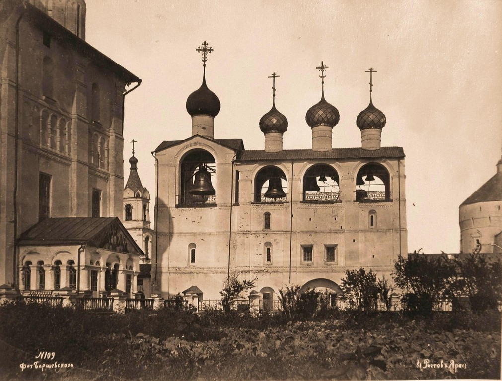 古罗斯教堂建筑的一个重要元素是钟楼和钟铃墙。钟楼是一种塔式结构,顶部通常有一个穹顶б它可以附属于教堂,也可以独立于教堂。钟楼分为几层,上层比下层小。钟铃最常被放在上层,这样可以将声音传播到很远的地方,有时钟铃被放在不同的层上。钟声从宽大的拱形窗户倾泻而出。