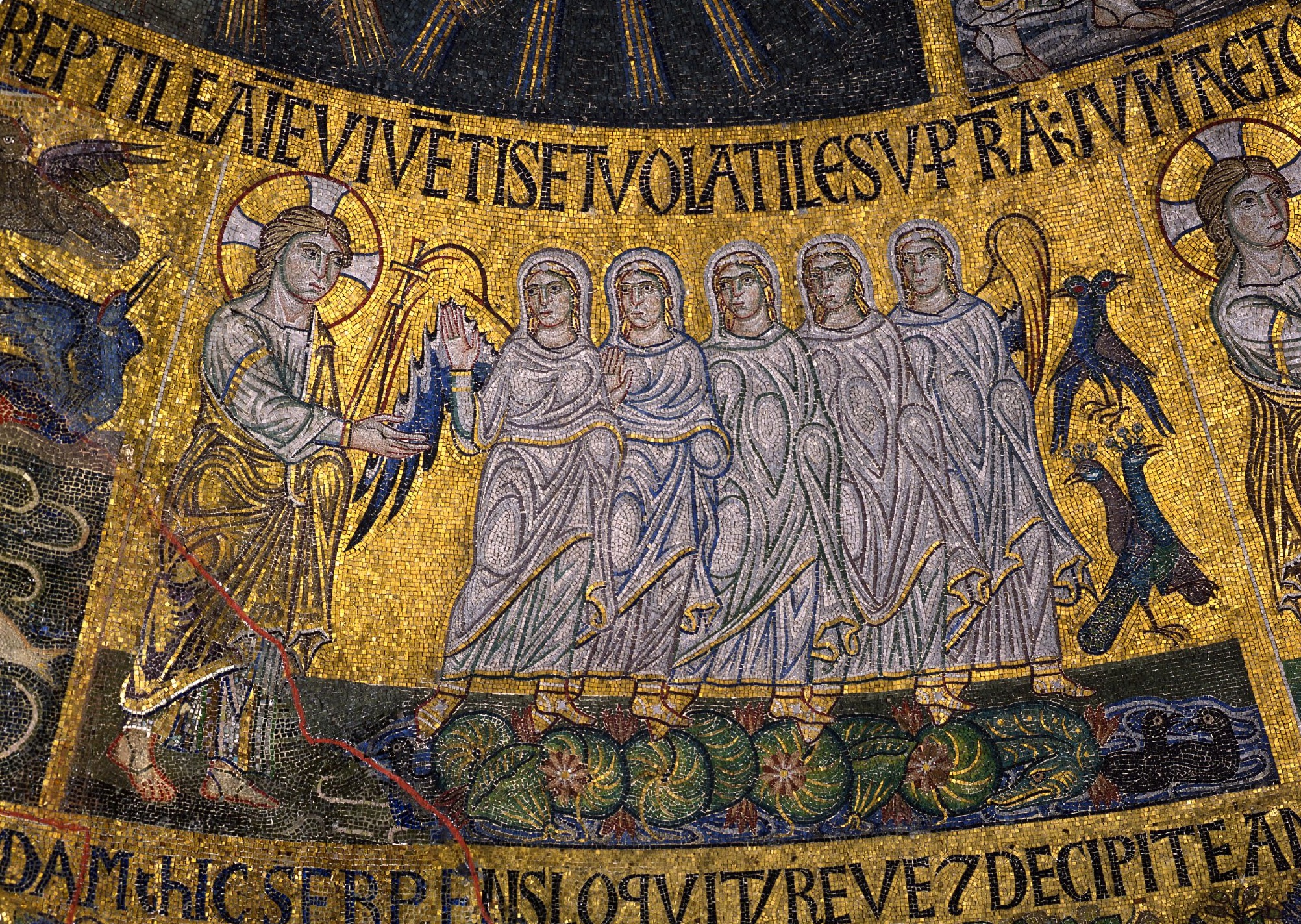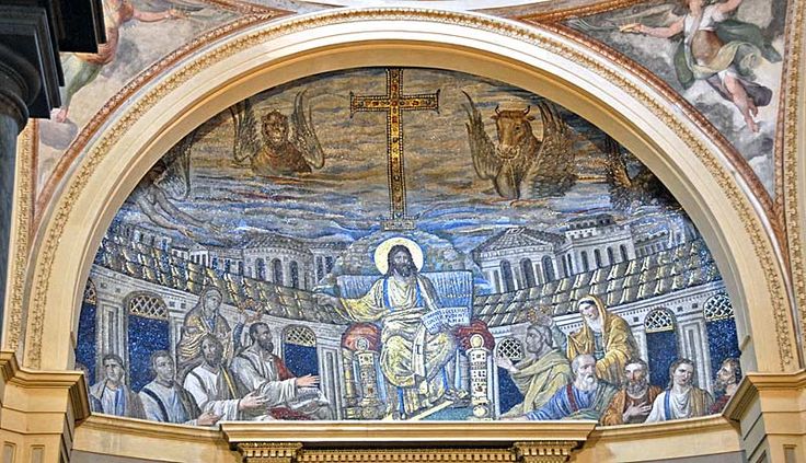 历史上第一幅带翅膀的天使图像被认为是在罗马的圣普登蒂亚纳大教堂中,是4世纪末的作品。它是在19世纪修复的,所以给人的印象不是很清晰。图画的底部是主耶稣基督和使徒,顶部是福音书作者的四个象征:天使、狮子、小牛和鹰。