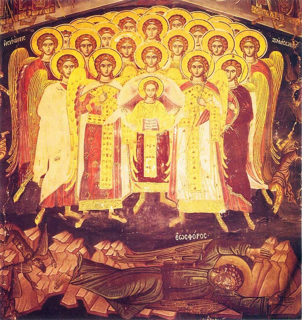 阿托斯的迪奥尼西亚特修道院食堂有一幅壁画。除了我们看得很清楚的天使群之外,下面还有一个堕落的天使,不再像那些保持尊严的天使一样明亮,而是一个黑暗的天使,署名为Εωσφόρος(Eosforos),用拉丁文听起来更熟悉的是路西法。这个词在俄语中被翻译为“承载光明”。