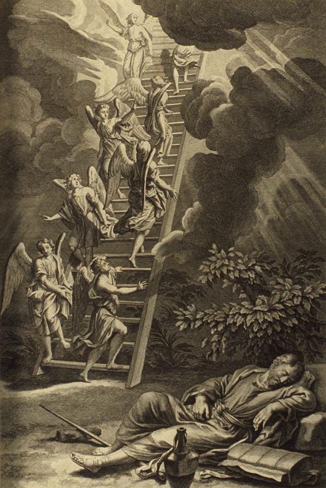 另一个呈现同样的天使形象的作品是《雅各布之梦》,即雅各布在梦中看到的著名天梯。它自地而建,直达天堂,天使沿着天梯上上下下,由此可见,天堂和大地是相通的,这个地方被雅各称为有福的地方,后来在那里为主建立了一个祭坛。