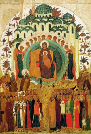 在所有这些圣像画中,我们能看到天下所有受造物在荣耀中联合在一起:奔跑的动物,歌唱的鸟,甚至在水中游动的鱼。在这些圣像画中,所有的受造物所屈从的那个共同的计划无一例外地被描绘成大教堂的形式,天使奔向那里,圣徒在那里聚集。天上的植物环绕在它周围,动物在它的脚下或周围簇拥。