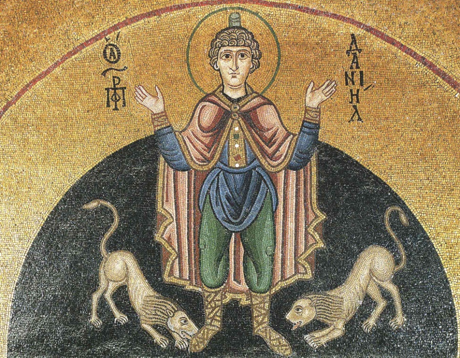 先知但以理在狮子坑中。壁画。Osios Lucas 修道院。希腊。10世纪