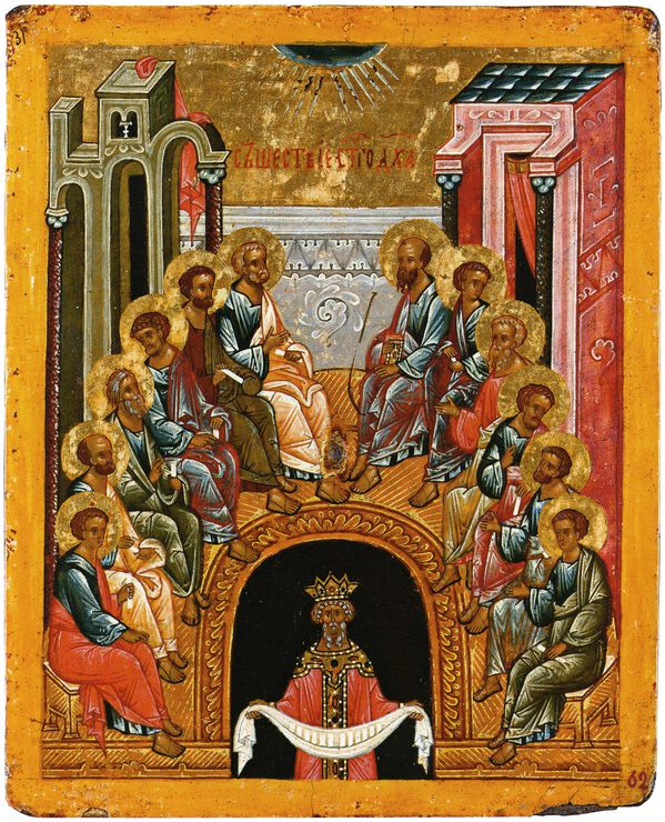 在一些古罗斯的五旬节圣像画上,描绘了一个戴着王冠的人在一个黑暗的壁龛中,上面写铭文着:“宇宙”。这个形象有时被解释为宇宙的象征,通过圣使徒的福音传播受到圣灵的启示。 Е. 特鲁贝兹科伊在“宇宙之王”中视为原始宇宙的象征,它被罪恶所禁锢的状态,与被圣灵之恩典所充满而容纳世界的圣殿形成对比: