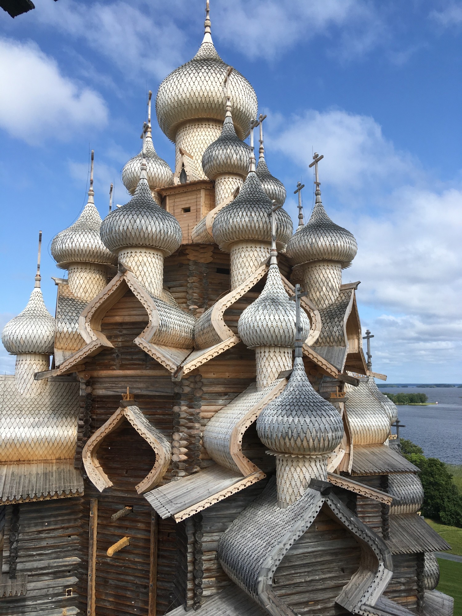 这是俄罗斯木匠工艺的杰作,除了之外圆顶之外,没有钉子。八角形的木屋由2250根原木组成,建筑高度为37米。教堂有22个头像,处在屋顶上,类似于祈祷时的双手合十。它具有实用价值,因为在下雨时,水从屋顶上向下流动时,不会淹没墙壁。由杨树制成的鳞片在阳光下反射出不同的颜色,形成一种特殊的色彩效果。圆顶根随天气、时间和季节的不同而改变其颜色。这座教堂因其独创性和惊人的美丽而从岛上的其他建筑中脱颖而出。