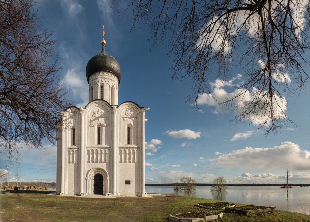 传说,它是在12世纪一年之内在涅尔河畔建成的,至今被认为是俄罗斯古代建筑的一颗璀璨的明珠。这座教堂是为了纪念对布勒格人的胜利,也迫使他们为建造教堂而带来石头。为了防止教堂被淹没,使它建在一个人工堆砌出的高大山丘上。它的外墙有《圣经》中统治者大卫王的浮雕作为装饰。大卫王被认为是一个明智而公正的国王,在雕塑中被狮子围绕着。鸽子、秃鹫和其它神话中的动物的浮雕也被使用。